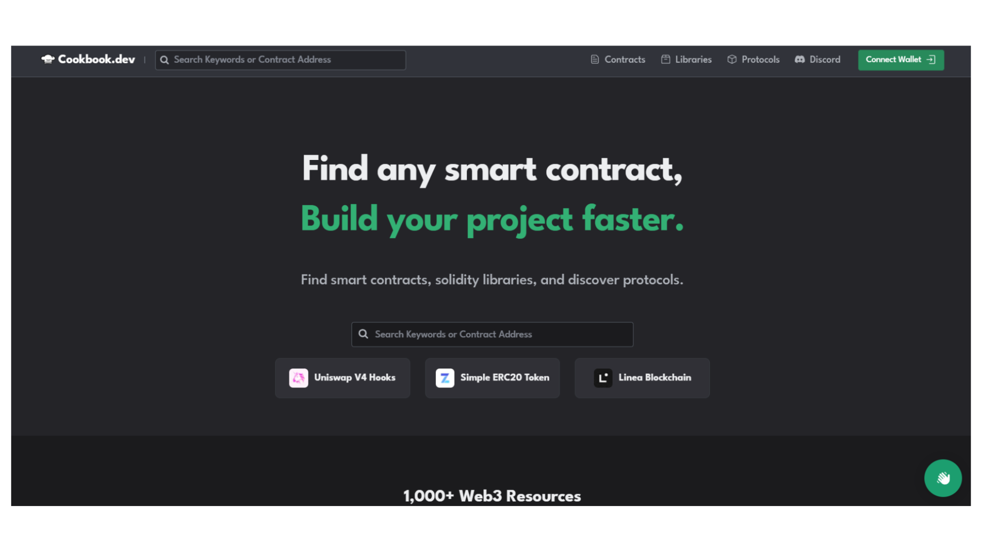 Cookbook is an open-source smart contract registry that provides developers access to Solidity primitives, libraries, and smart contracts for protocols across EVM-compatible blockchains. It integrates with a wide range of blockchain-native developer tooling, making it one of the quickest and easiest ways to start development work around smart contracts.